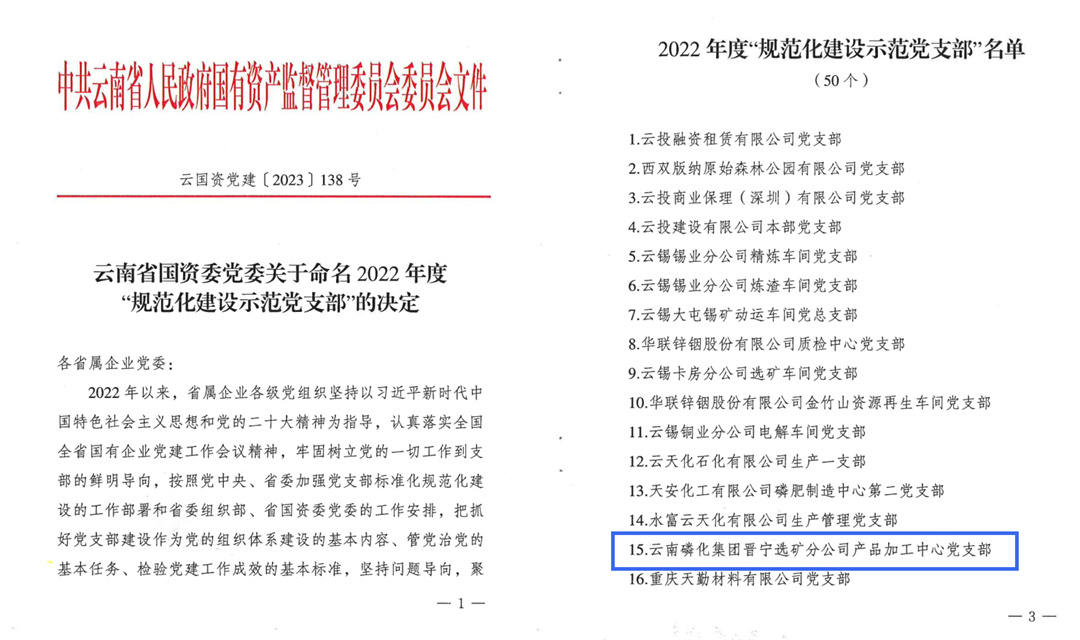 10月7日,云南省國資委黨委發(fā)布了關(guān)于命名2022年度“規(guī)范化建設(shè)示范黨支部”的決定,公司晉寧選礦分公司產(chǎn)品加工中心黨支部名列其中。